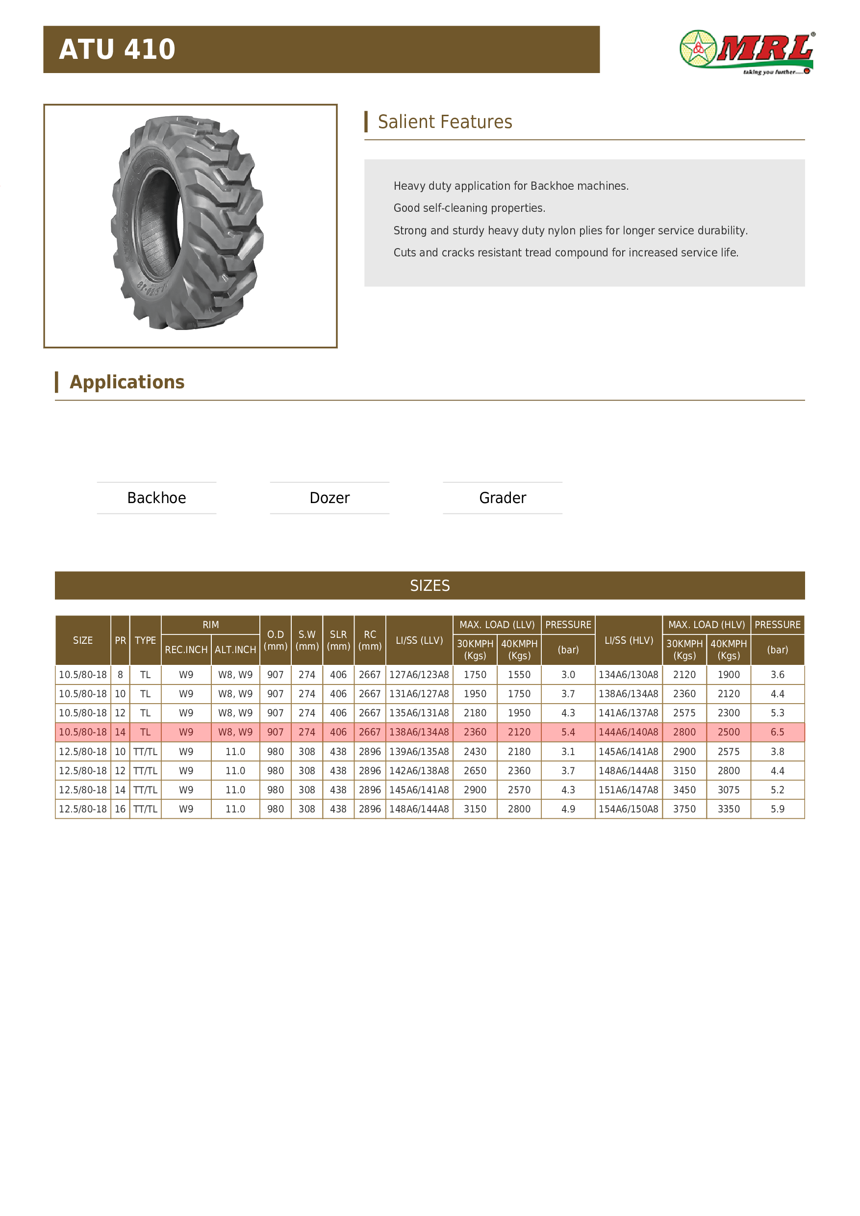 10.5/80-18 (280/80-18) MRL ATU 410 14PR 138A6 TL