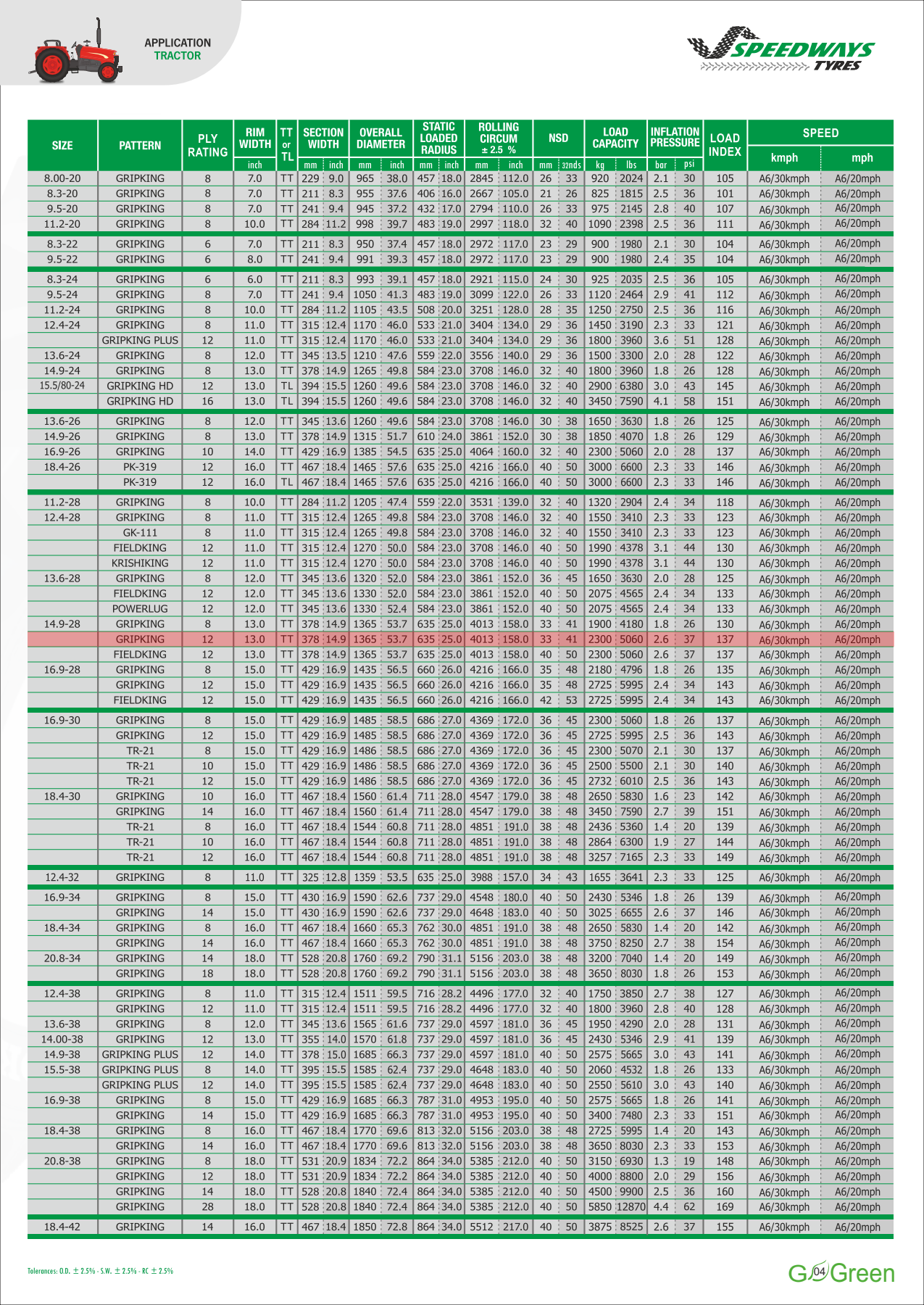Speedways Gripking jest wytrzymałą oponą rolniczą sprawdzoną przez naszych klientów. Jej głównymi cechami jest nowy, zapewniający maksymalną trakcję bieżnik. Dodatkowo dzięki wysokim klockom bieżnika i wolno ścierającej się mieszance opona ta sklasyfikowana jest jako bardzo żywotna, zapewniająca długą i bezproblemową pracę. Doskonały współczynnik jakości do ceny.