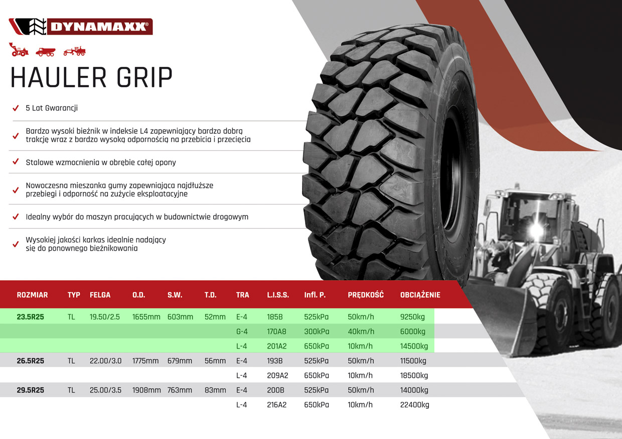 Dynamaxx Hauler Grip – opony przemysłowe w rozmiarze 23.5R25 to opona przemysłowa wielkogabarytowa OTR o bezdętkowej konstrukcji, która dzięki bardzo wysokiemu bieżnikowi w indeksie L4 stanowi idealny wybór do maszyn pracujących w budownictwie drogowym. Masywność bieżnika opony zapewnia również wybitną odporność na wszelkie przebicia i przecięcia, jednocześnie zachowując bardzo dobrą trakcję w każdych warunkach. Za wysoką odporność na zużycie eksploatacyjne i najdłuższe przebiegi odpowiadają stalowe wzmocnienia w obrębie całej opony jak i nowoczesna mieszanka gumy. Dynamaxx Hauler Grip posiada również dodatkowy pas boczny który chroni ściany modelu Hauler Grip przed wszelkimi uszkodzeniami, co minimalizuje wszelkie szanse na uszkodzenia podczas wymagającej pracy. Dzięki doskonałemu prowadzeniu na drodze, równomiernym zużywaniu się bieżnika oraz zaprojektowaniu z myślą o wyjątkowo ciężkiej pracy Dynamaxx Hauler Grip stanowi idealny wybór do wszelkich wozideł i ładowarek przemysłowych takich firm jak Liebherr, CAT (Caterpillar), Volvo, Komatsu czy Doosan.