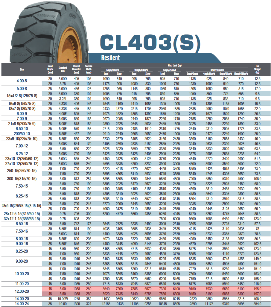 Model CL403 charakteryzuje się doskonałą przyczepnością, stabilnością jazdy oraz równomiernym rozkładem nacisku, co przekłada się na komfort operatora i mniejsze zużycie maszyny. Bieżnik został zaprojektowany tak, aby zapewnić maksymalną trakcję na różnych nawierzchniach, zarówno w magazynach, jak i na placach przeładunkowych.
