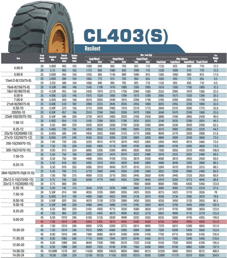 Model CL403 wyróżnia się masywną, trójwarstwową budową zapewniającą stabilność, równomierne zużycie oraz doskonałą amortyzację w porównaniu do klasycznych opon pneumatycznych. Indeks nośności 172A2 potwierdza gotowość do pracy z dużymi obciążeniami, typowymi dla sprzętu logistycznego i przemysłowego.